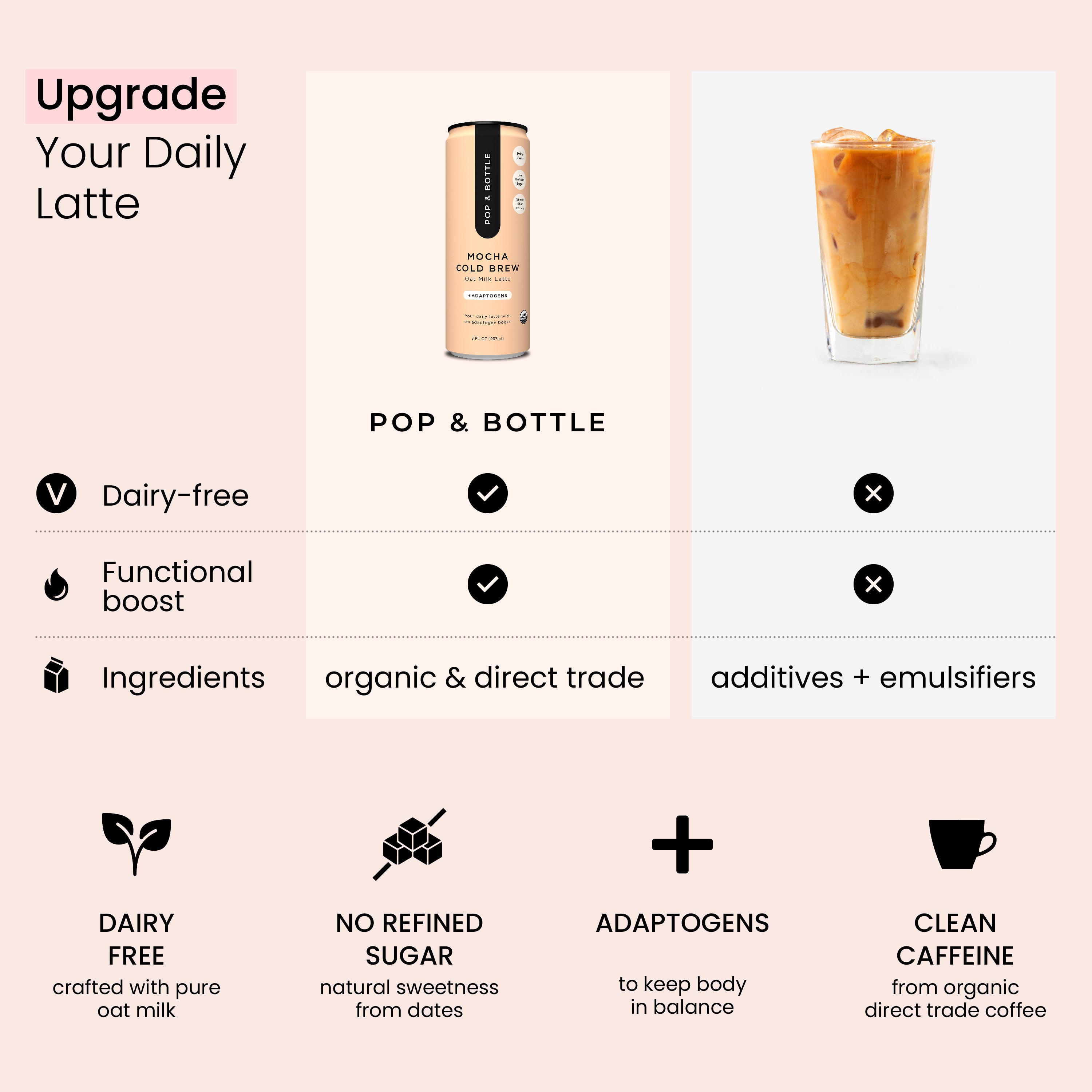 A delicious and de-stressing mocha latte. Made with fair-trade. organic coffee. pure oat milk. a hint of sweetness from dates. and an adaptogenic blend of ashwagandha and maca to aid in stress defense. This is your daily latte with benefits.